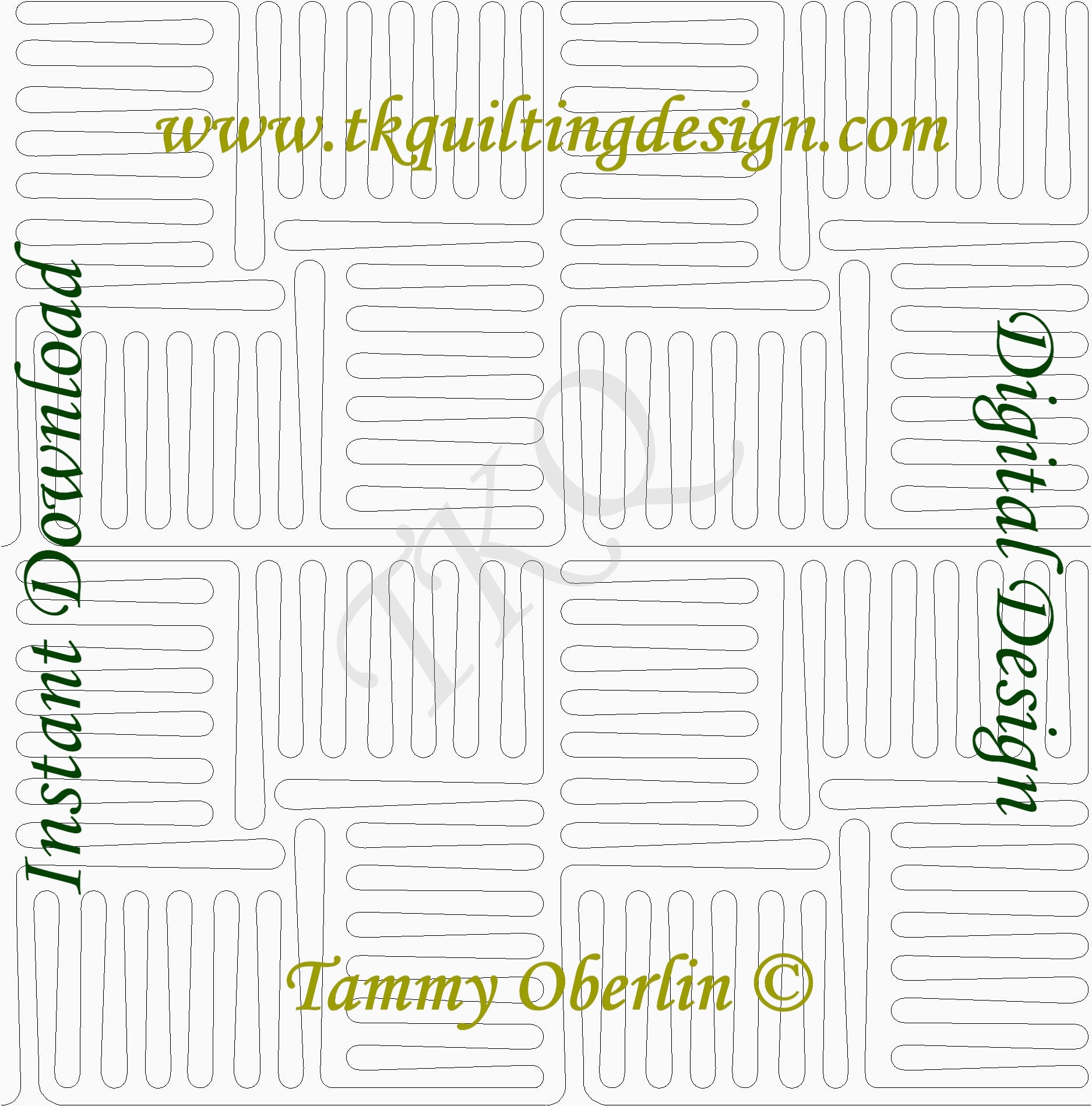 Digital quilting pattern by Tammy Oberlin-Bramer. For use with computerized quilting systems. Designed as a continuous edge to edge or allover pattern. Designed at 20.95" x 20.96", but can be easily re-sized. This is a dense pattern at the designed size. Use positive vertical spacing when setting up your E2E. Recommended for machines with an arm space of at least 20".