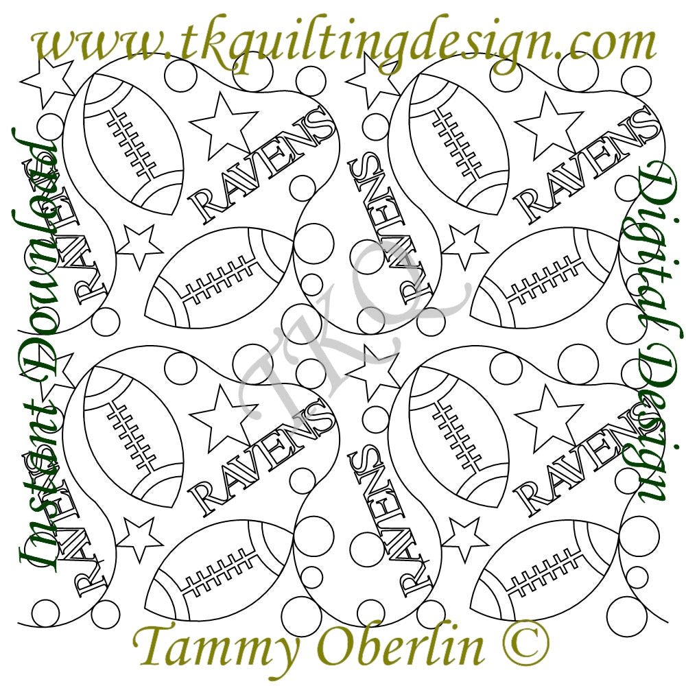 Digital quilting pattern by Tammy Oberlin-Bramer. For use with computerized quilting systems. Designed as a continuous edge to edge or allover pattern which stitches continuously from the left to right side of the quilt. Designed at 18" W x 16.19" H, but can be easily re-sized. Minimal retraced areas on the footballs.