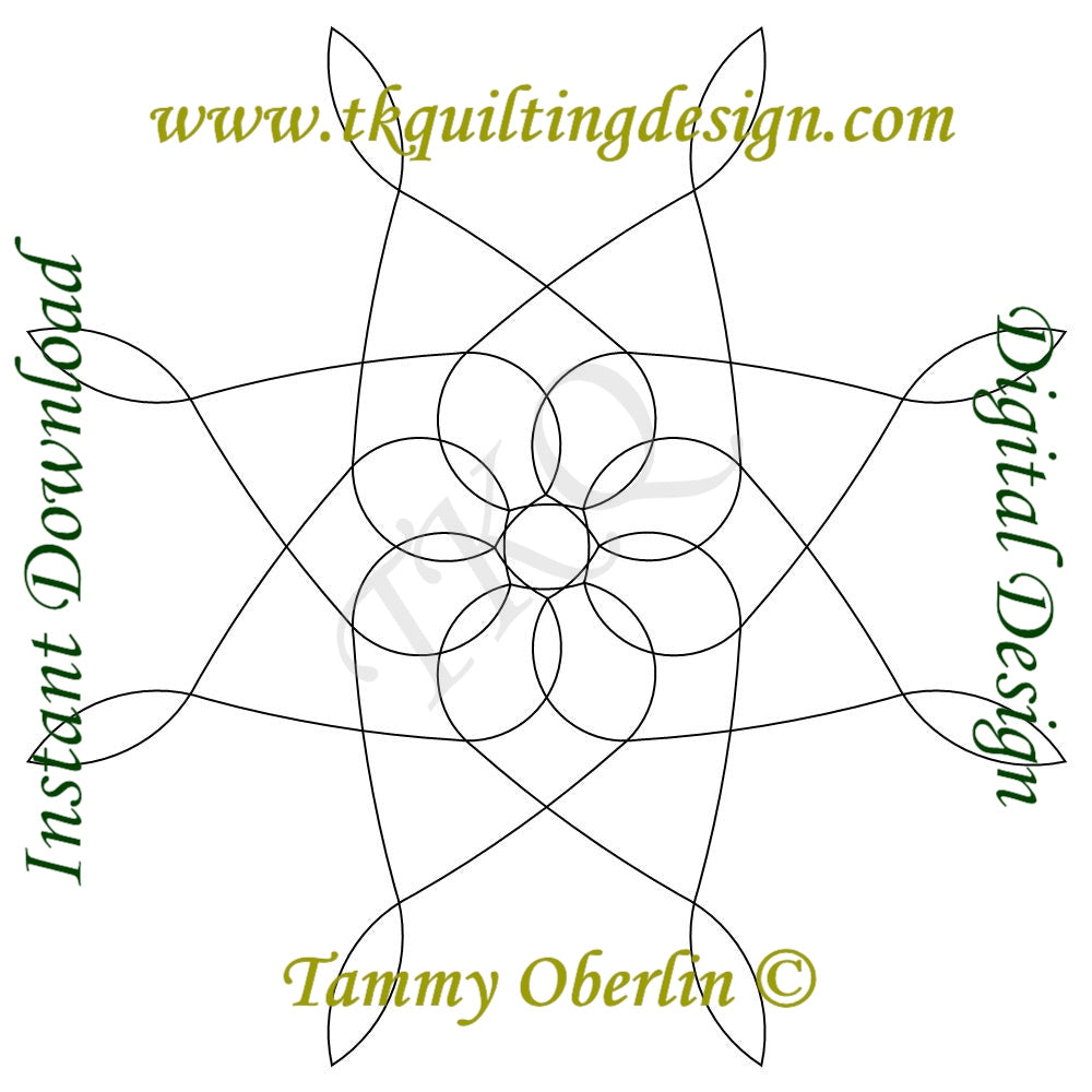 Digital quilting pattern by Tammy Oberlin-Bramer. For use with computerized quilting systems. Designed as a block pattern. Designed at 11.89" x 11.89", but can be easily re-sized. Second image shows suggested use.